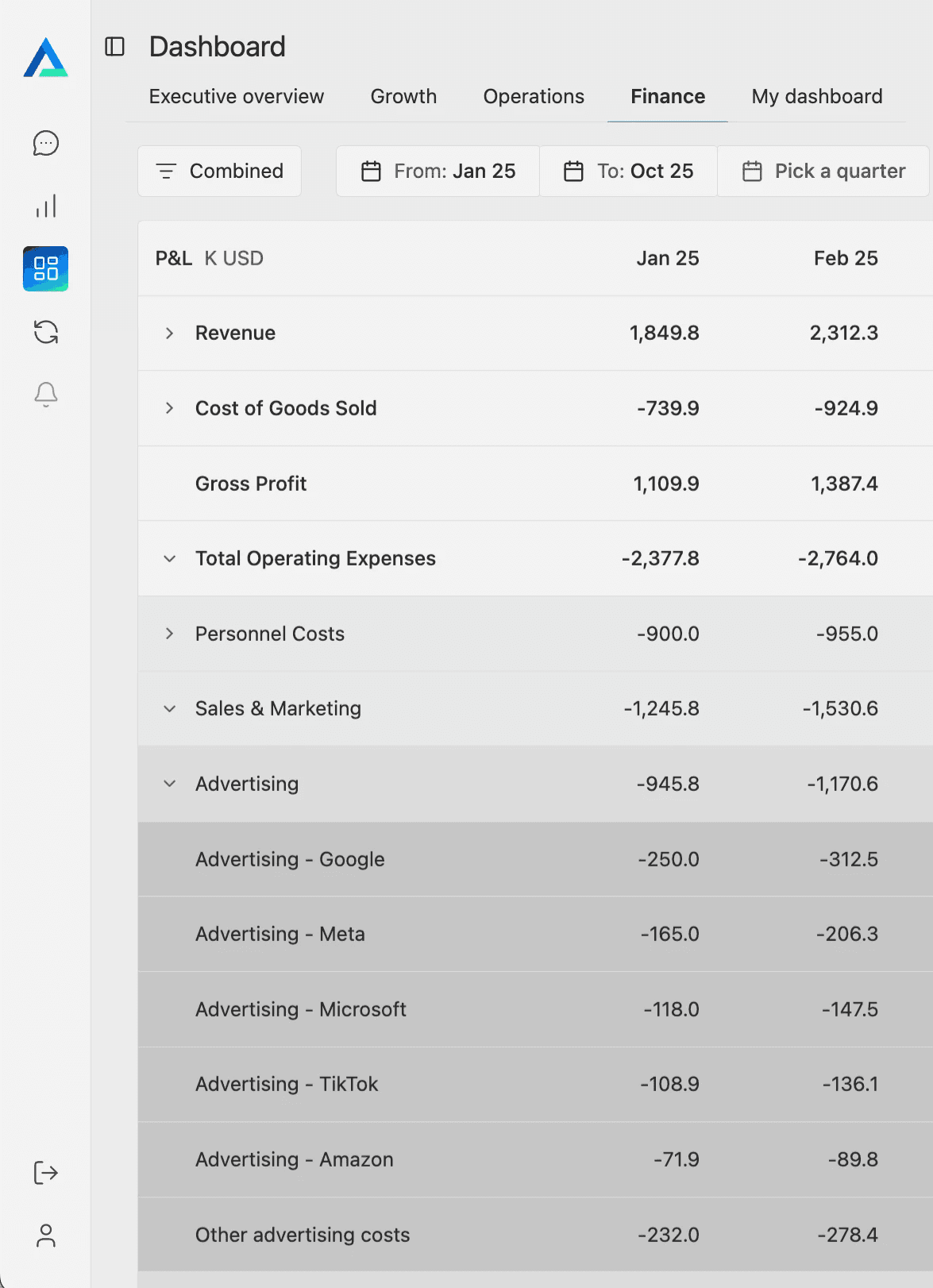 KPI Drill-down: Trace figures to understand the "why" and "from where" behind each number.